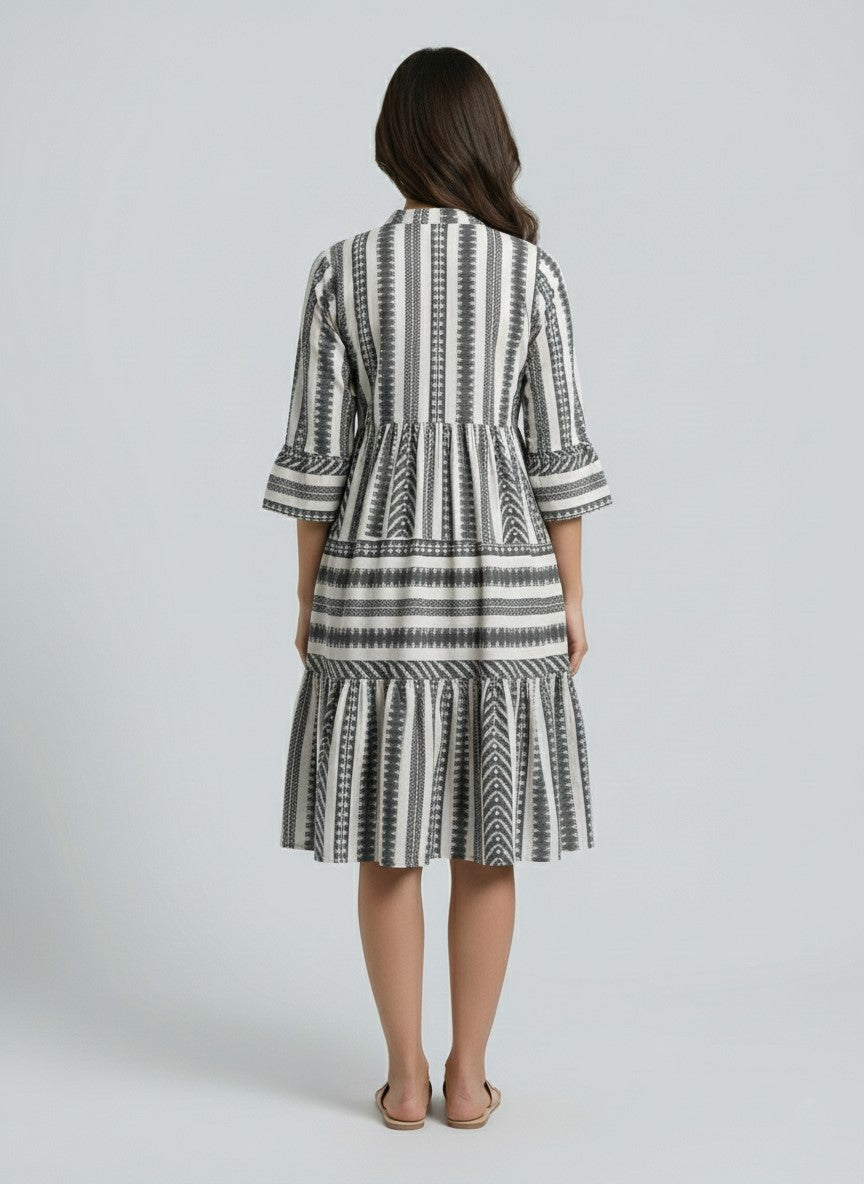 Women’s Black & White Printed Tiered Midi Dress | Mandarin Collar 3/4 Sleeve Casual & Office Wear Dress