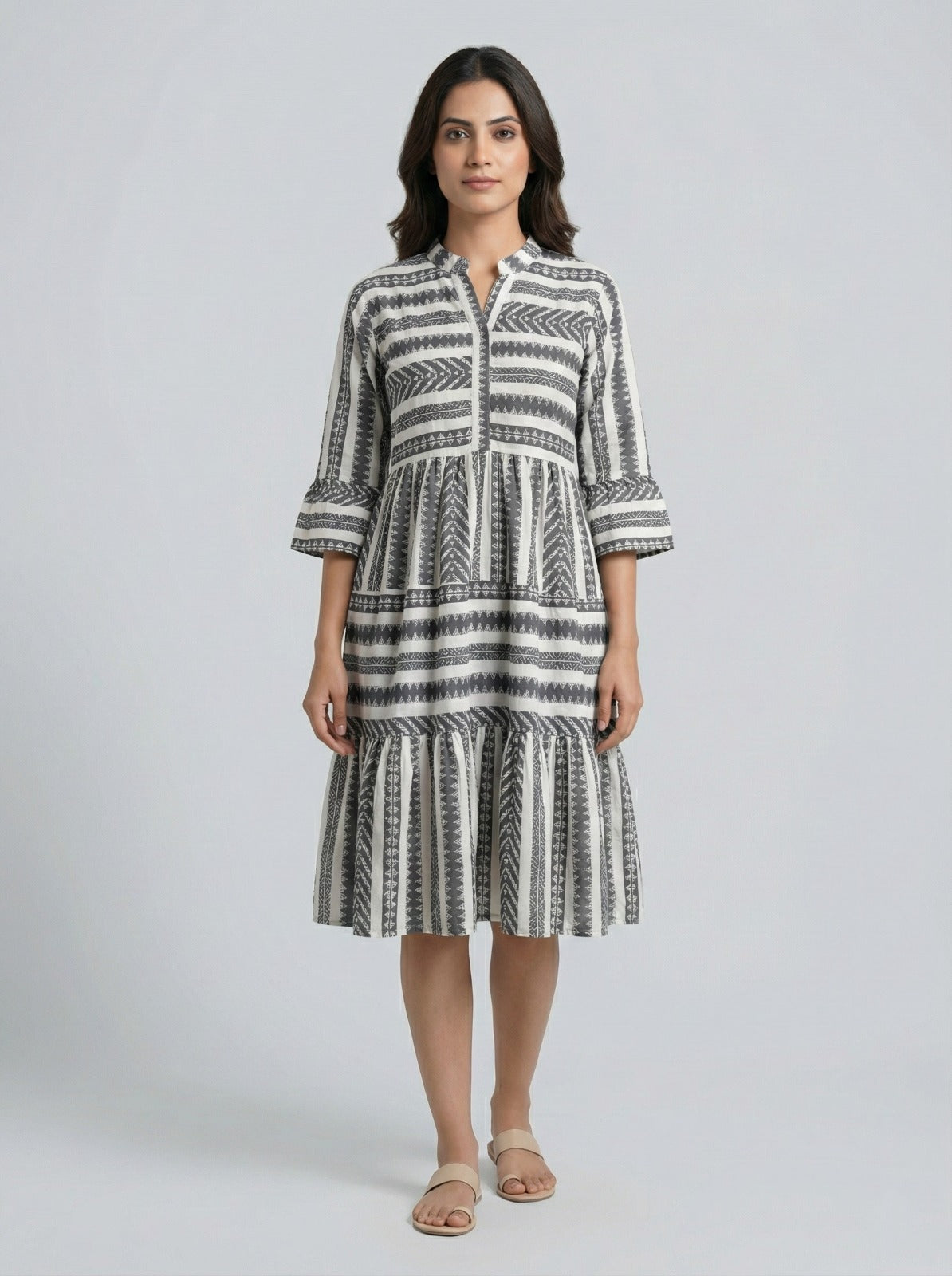 Designed with a smart mandarin collar, 3/4 bell sleeves, and a relaxed tiered silhouette, this dress offers a flattering fit that feels effortless from morning to evening. The structured yoke with flowing tiers creates balance and movement, making it comfortable without losing its polished look 👗✨.